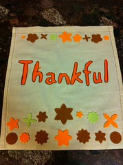 With scraps of cotton, some felt stickers, acrylic paint and a sharpie marker, we now have a banners to remind us and welcome friends as we approach Thanksgiving.